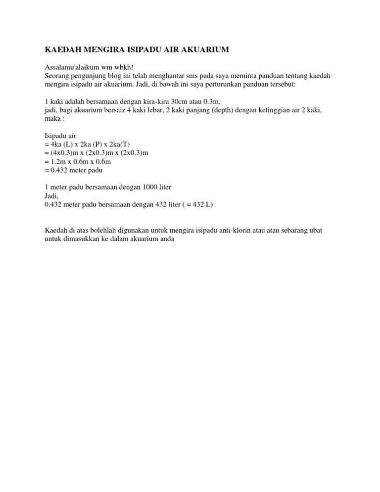 Kaedah Mengira Isipadu Air Akuarium