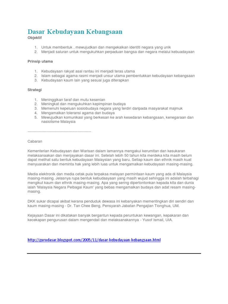 Dasar Kebudayaan Kebangsaan Dasar Kebudayaan Kebangsaan