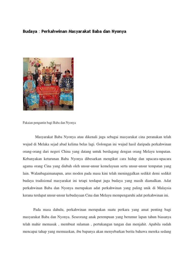 Selain itu perkahwinan dapat m. Masing masing terikat dengan kerja dan ia dilihat tidak lagi relevan katanya. Walaupun adat perkahwinan baba dan nyonyaini nampaknya merumitkan namun adat ini terutamanya yang meperlihatkan betapaistimewanya masyarakat baba dan nyonya dimata masyarakat malaysia. Perkahwinan kaum ini banyak mengikut cara perkahwinan seperti masyarakat cina seperti upacara cheo thau.