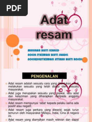 Adat jenis ini merangkumi kebiasaan atau kelaziman manusia daripada. Buku ini menghuraikan adat resam masyarakat berbilang kaum yang terdiri daripada masyarakat melayu cina india siam orang asli sikh baba pribumi sabah dan sarawak. Ia juga merupakan undang undang atau hak yang tak tertulis dalam sesebuah masyarakat. Ia meliputi saat kelahiran kematian kunjungan dan anutan agama bagi dihayati bersama untuk sebuah kehidupan masyarakat yang aman dan damai.