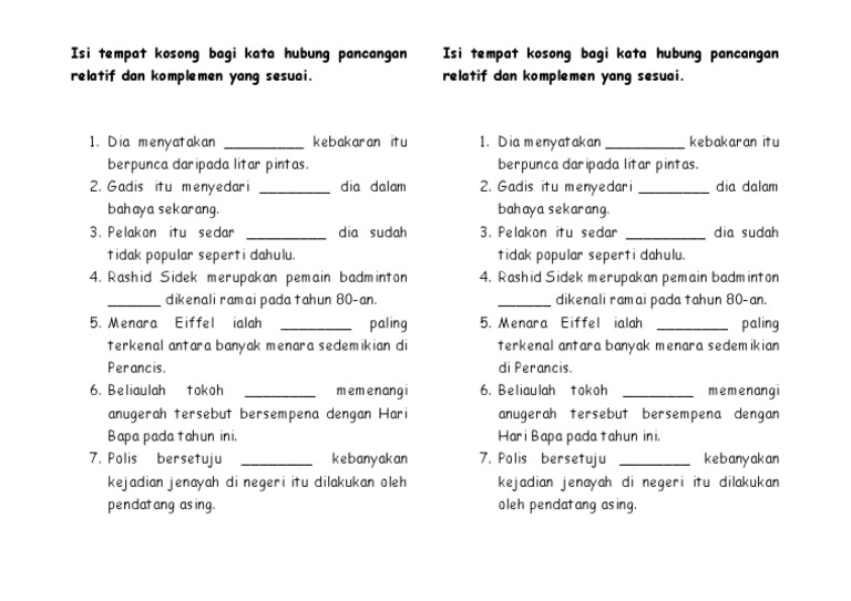 Latihan Kata Hubung Pancangan Relatif Dan Komplemen Yang Sesuai