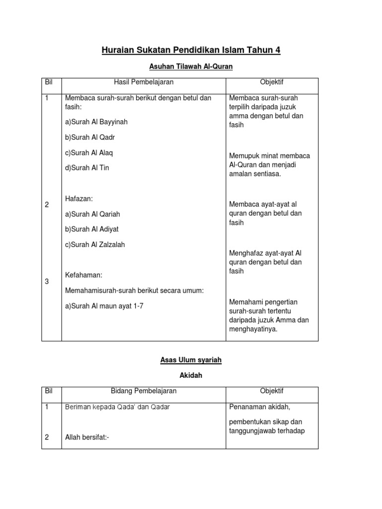 Huraian Sukatan Pendidikan Islam Tahun 4 Asuhan Tilawah Al Quran
