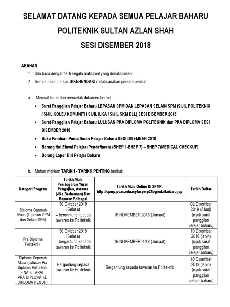 Pendaftaran Pelajar Baharu Sesi Dis 2018
