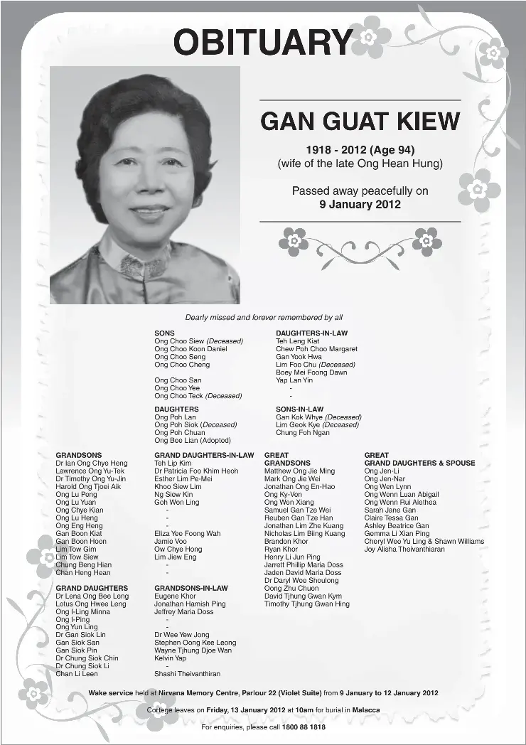 Pressreader The Star Malaysia 2012 01 11 Gan Guat Kiew 1918 2012 Age 94 Wife Of The Late Ong Hean Hung Passed Away Peacefully On 9 January 2012