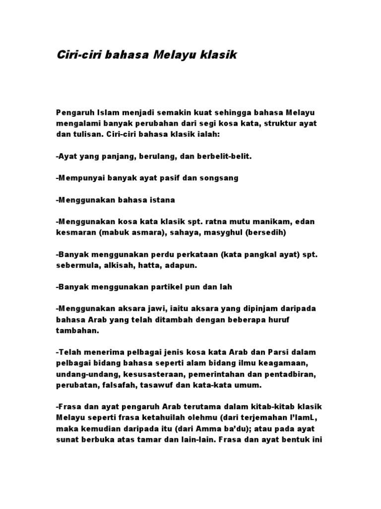 Ciri Ciri Bahasa Melayu Klasik