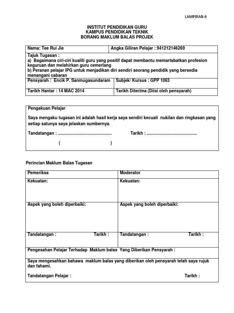 Borang Maklumbalas Tugasan Pelajar