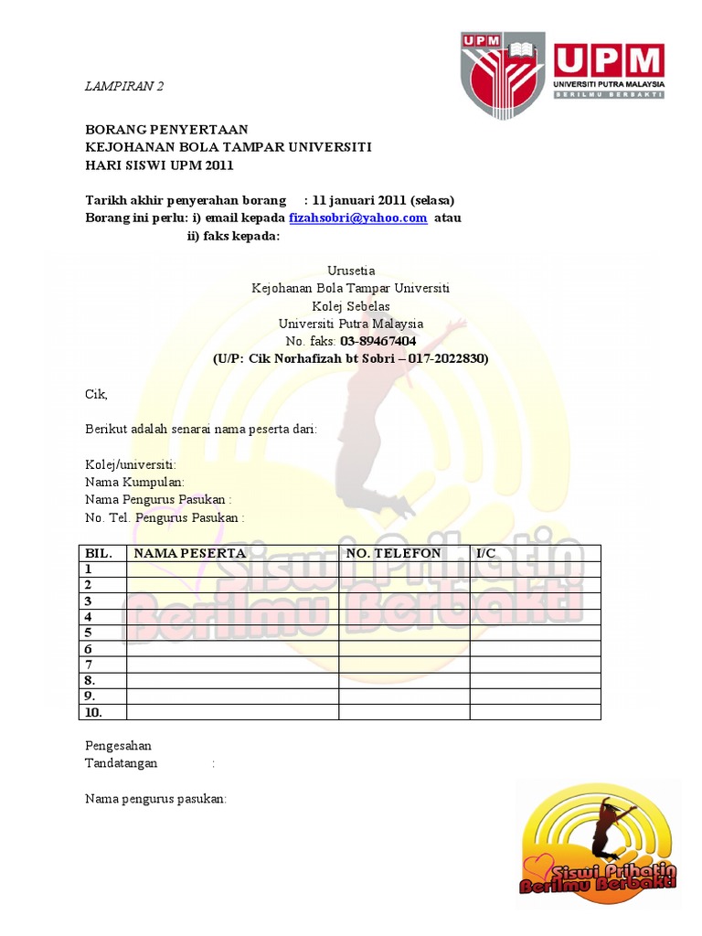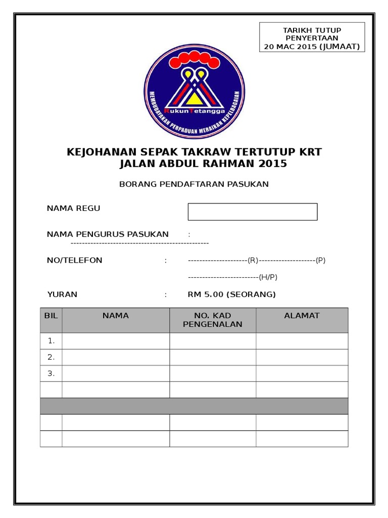 Contoh borang penyertaan pertandingan sepak takraw. 3 1 hanya pemain pemain yang didaftarkan dalam borang penyertaan sahaja dibenarkan bermain di sepanjang pertandingan ini. Pertandingan sepak takraw jpm 2012 1. 3 2 sepak takraw bakat baru. Permainan akan dijalankan secara regu 3 2 semua pemain diwajibkan membawa bersama pas pekerja surat tawaran pekerjaan pada hari pertandingan.