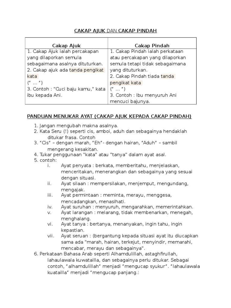 Contoh cakap ajuk kepada cakap pindah. Cakap ajuk dan cakap pindah 1. Cakap ajuk cakap pindah saya aku hamba beta kami kita anda awak kamu engkau dia beliau mereka ini itu sini begini demikian ini sekarang malam tadi semalam hari ini esok dia ia nya beliau baginda mereka saya dia nya dia beliau. Anda sepatutnya tekun membuat kerja rumah kata ahmad kepada adiknya. Kamu ini semakin gemuk vii salmah berkata emaknya telah dihantar ke hospital pada hari semalamnya.