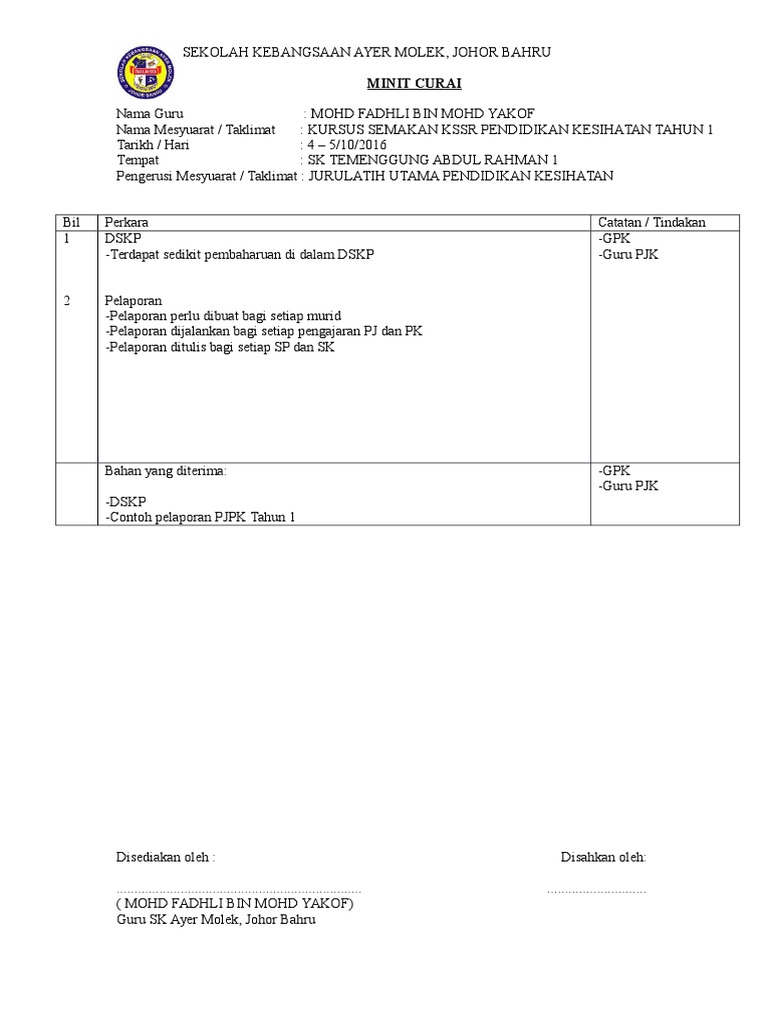 Minit Curai Kursus Semakan Kssr Pk Tahun 1 Docx