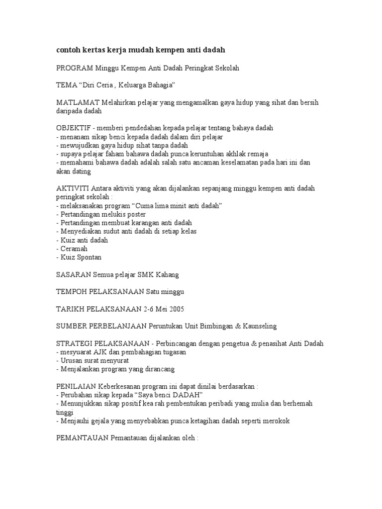 Contoh Kertas Kerja Mudah Kempen Anti Dadah