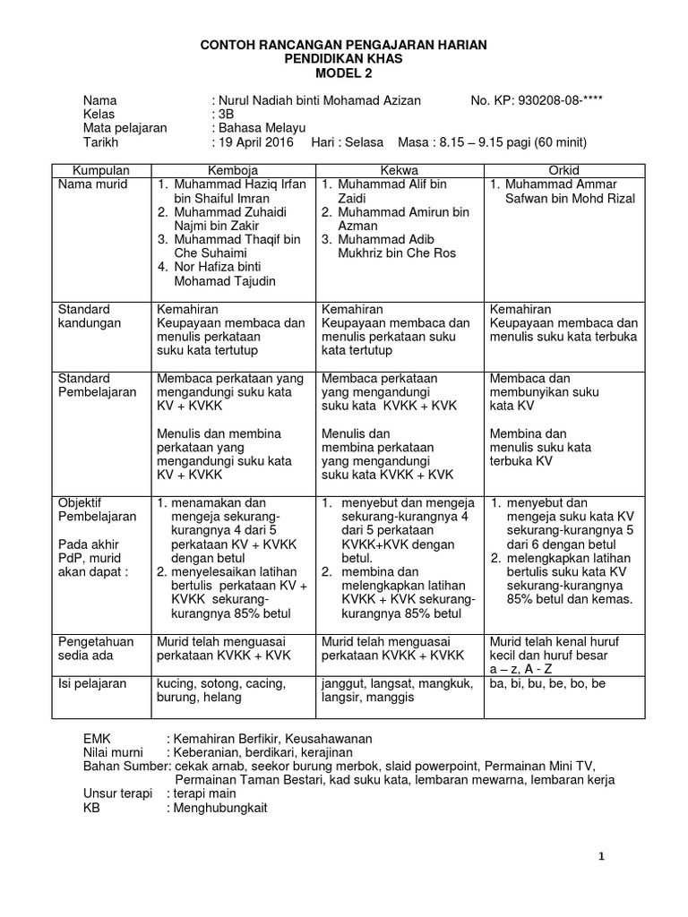Contoh Rancangan Pengajaran Harian Pendidikan Khas Bahasa Malaysia Suku Kata Kv Kv Kvk