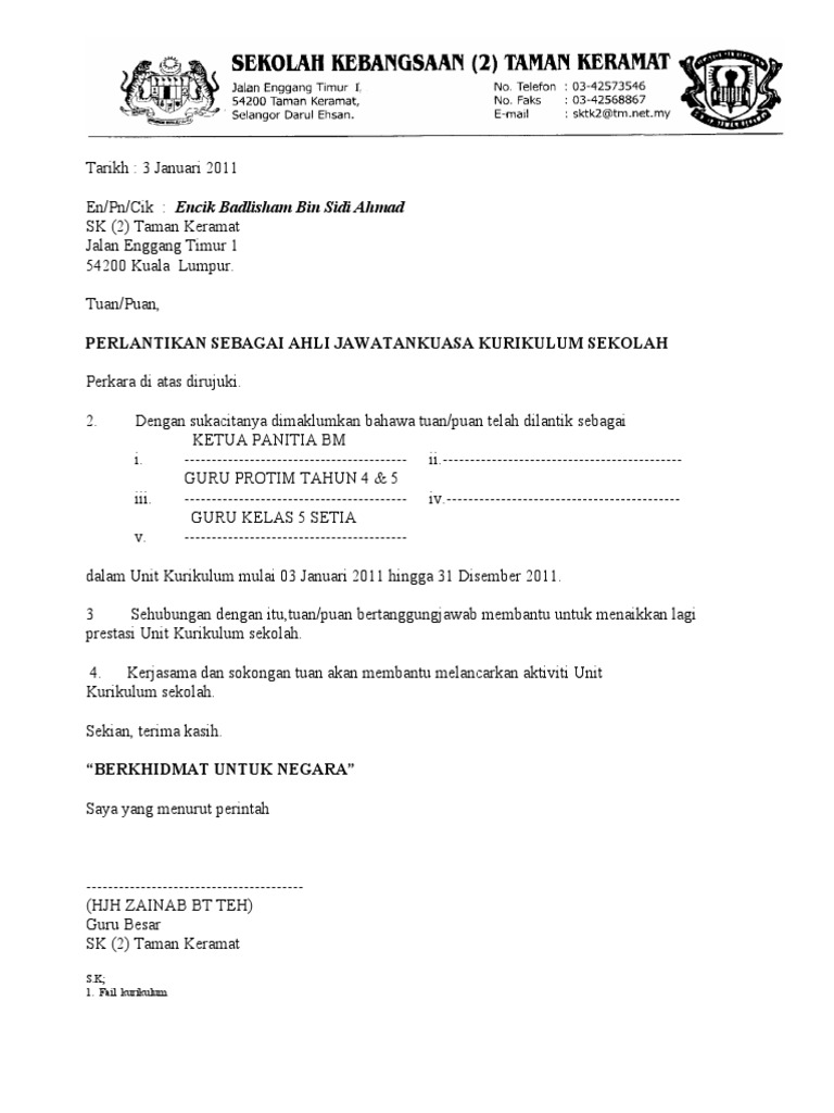 Contoh Surat Lantikan Jawatankuasa Sekolah
